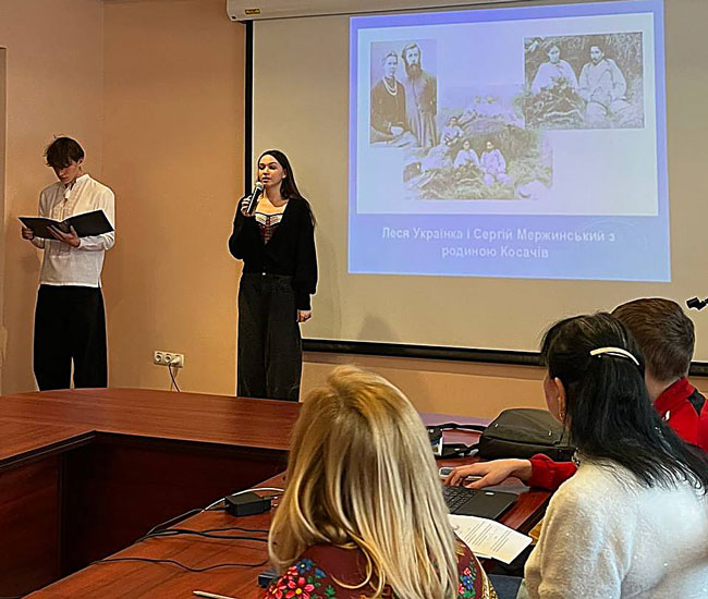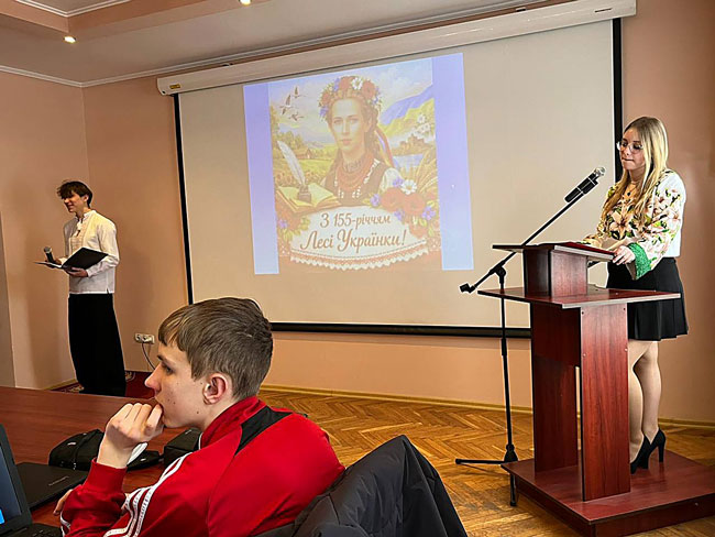 25 лютого в конференц-залі коледжу викладачі циклової комісії філологічних дисциплін Анна МУСЯЛО та Галина ГУЦУЛ провели літературно-музичну композицію «Я в серці маю те, що не вмирає!» з нагоди 155-річного ювілею геніальної доньки українського народу Лесі Українки.