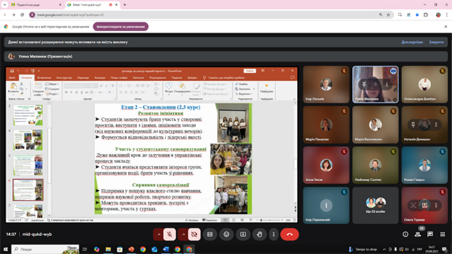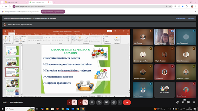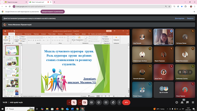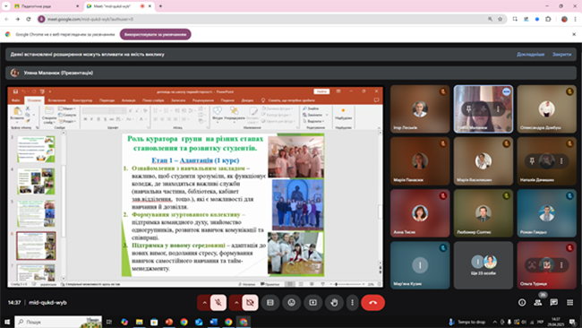 У виступі було висвітлено вимоги до професійної компетентності куратора, окреслено особливості організації роботи з академічною групою та визначено ефективні підходи до супроводу студентів у процесі їхнього становлення.