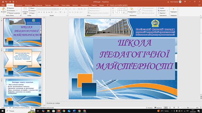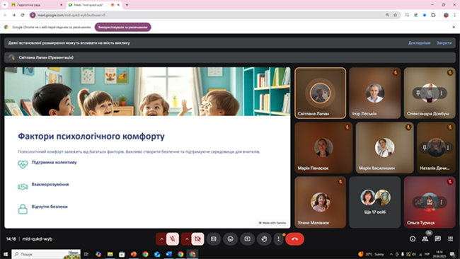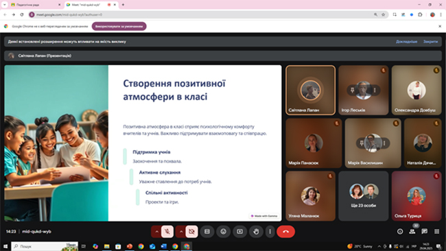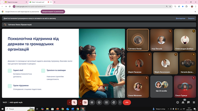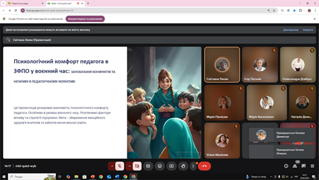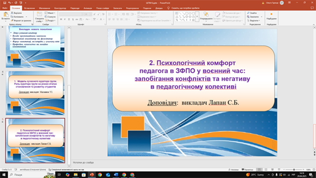Викладачка циклової комісії технології харчових продуктів та напоїв Світлана ЛАПАН презентувала доповідь на тему: «Психологічний комфорт педагога в ЗФПО в умовах воєнного стану: запобігання конфліктів та негативу в педагогічному колективі».