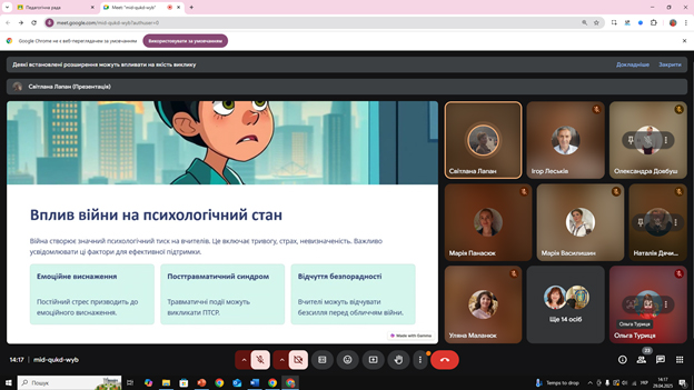 Під час доповіді розглянуто механізми формування психологічно безпечного та підтримувального середовища, методи профілактики емоційного вигорання та підходи до конструктивного розв’язання конфліктних ситуацій у колективі.