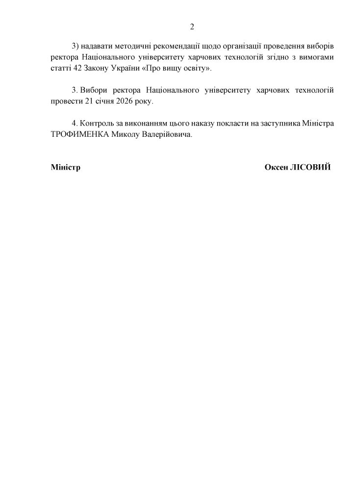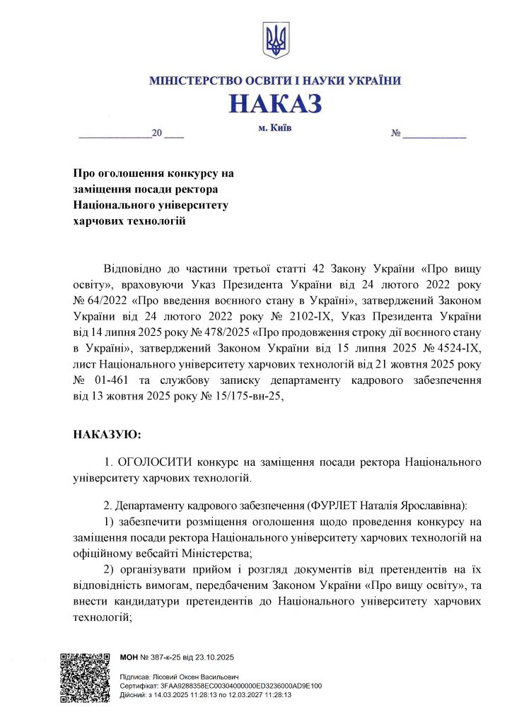 Вибори ректора МОН оголошує конкурс на заміщення посади ректора Національного університету харчових технологій Наказ про організацію виборів ректора Національного університету харчових технологій