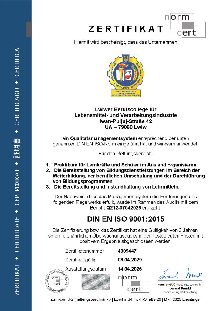 ВСП «Львівський фаховий коледж харчової і переробної промисловості НУХТ» успішно пройшов міжнародну сертифікацію системи управління якістю та отримав сертифікат відповідності стандарту DIN EN ISO 9001:2015.