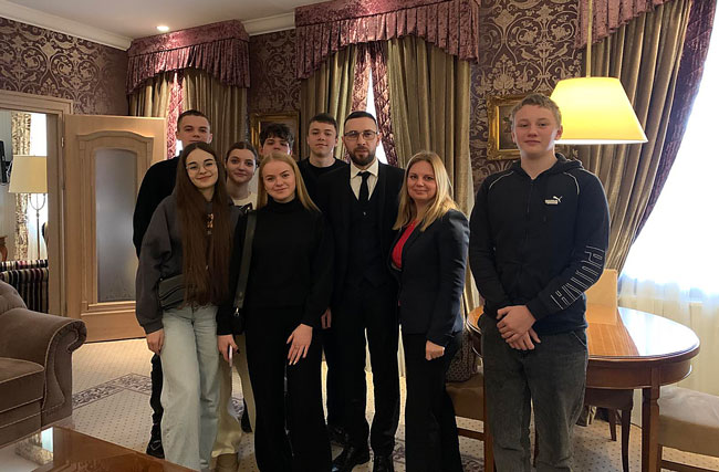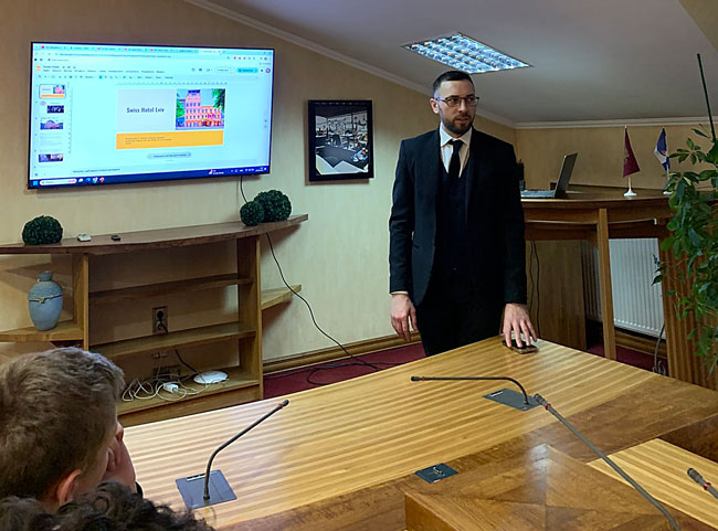 Михайло Шевелюк — маркетинг-менеджер готелю, адміністратор ресторану «Валентино», керівник Української школи гостинності, експерт ресторанного сервісу, доктор філософії з культурології — розповів студентам історію створення готелю, ознайомив з особливостями його діяльності та провів екскурсію номерним фондом і рестораном.