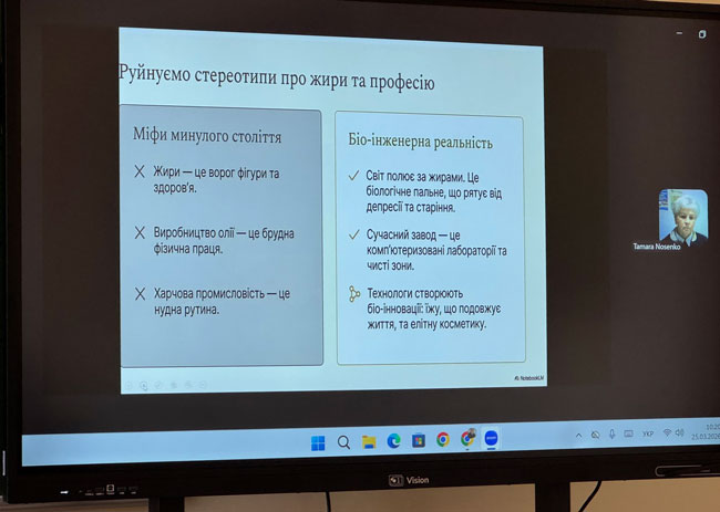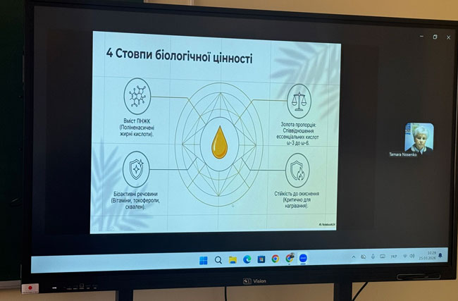 25 березня у ВСП “Львівський фаховий коледж харчової і переробної промисловості НУХТ” відбулася гостьова лекція для здобувачів освіти технологічного відділення, спеціальності «Харчові технології» на тему: «Рідке золото у твоєму раціоні: як рослинні олії керують здоров’ям та чому за цим майбутнє».