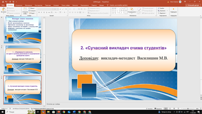 Другим питанням стало обговорення теми «Сучасний викладач очима студентів». Доповідь представила Марія ВАСИЛИШИН, викладачка циклової комісії економічних дисциплін. Вона поділилася результатами спостережень і опитувань, які допомагають краще зрозуміти очікування й потреби здобувачів освіти щодо ролі викладача сьогодні.