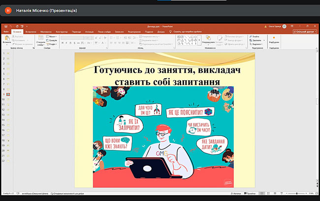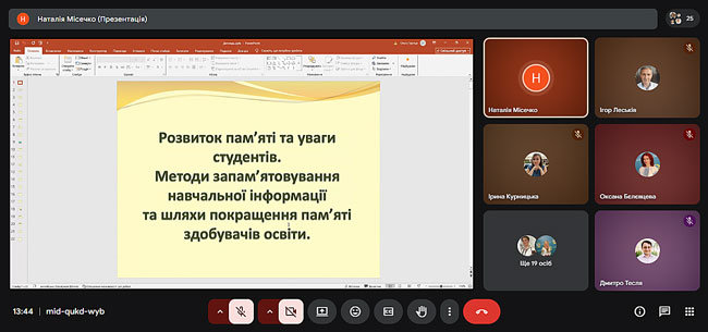 З доповіддю виступила кандидат технічних наук, Містечко Наталія, яка ознайомила присутніх із ефективними прийомами розвитку пам’яті та концентрації уваги студентів. Особливу увагу було приділено практичним методам запам’ятовування навчального матеріалу та педагогічним стратегіям, що сприяють підвищенню навчальної мотивації.